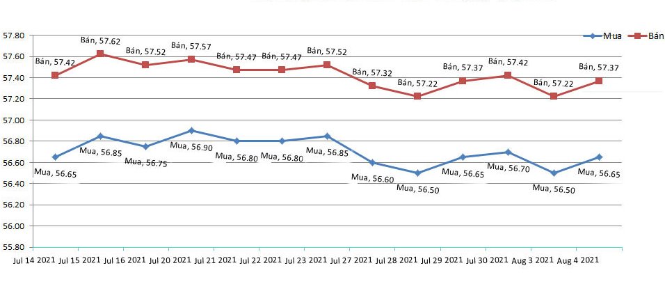 Giá vàng SJC tại Tập đoàn Doji, niêm yết trên thị trường Hà Nội mua - bán quanh mức 56,45 - 57,9 triệu đồng/lượng, đi ngang cả chiều mua vào và chiều bán ra so với chốt phiên trước. Chênh lệch mua – bán ở mức 1,45 triệu đồng/lượng.