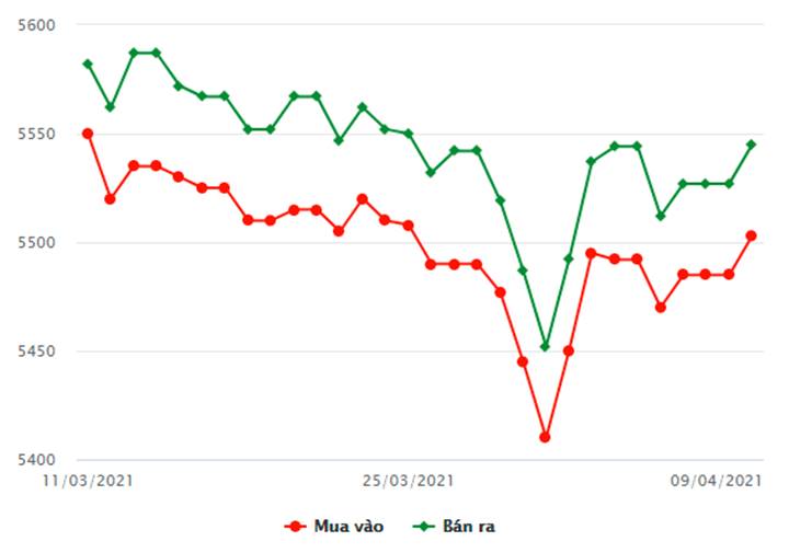 | Biểu đồ giá vàng trong nước tính đến sáng 9/4 |