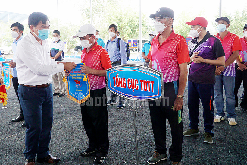 Ông Dương Hoàng Sum, Giám đốc Sở VH-TT-DL Trà Vinh trao cờ lưu niệm cho các đơn vị tham gia giải.