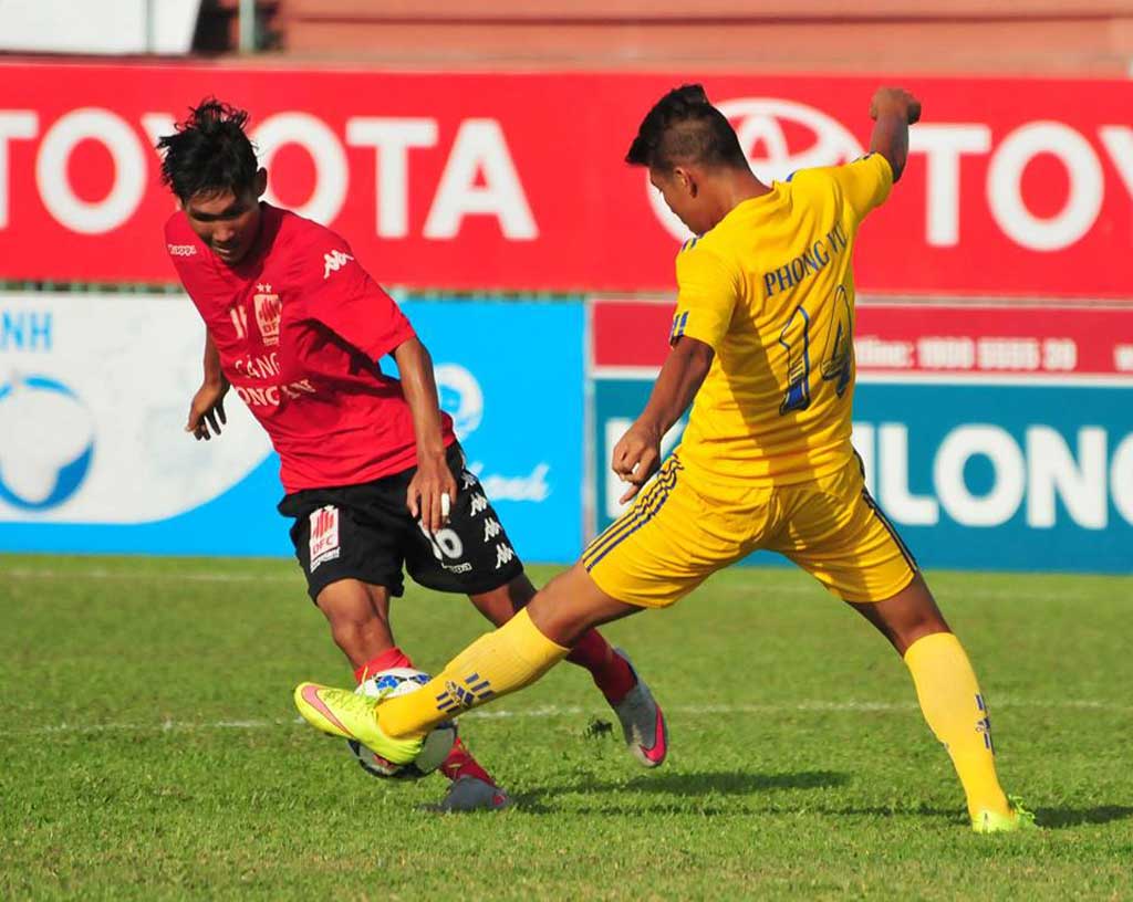 Long An (áo đỏ) có ba điểm đầu tiên trên sân nhà - Ảnh: Anh Tuấn.