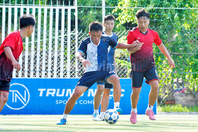 Pha bóng trong trận chung kết giữa Đoàn cơ sở Sở Văn hóa, Thể thao và Du lịch (áo xanh) và đội Đoàn cơ sở Sở Nông nghiệp và Phát triển nông thôn.