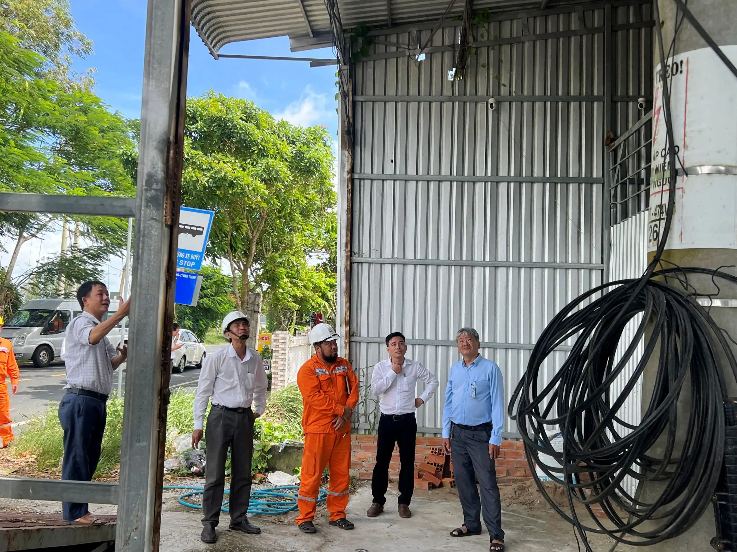 Đoàn kiểm tra thực tế việc tuân thủ các quy định về bảo vệ hành lang an toàn lưới điện cao áp tại kho xưởng của một hộ kinh doanh, trên tuyến đường Bốn Tổng - Một Ngàn, thuộc địa bàn huyện Cờ Đỏ.