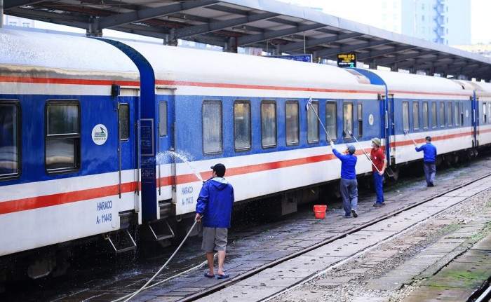 | Công nhân vệ sinh trong, ngoài các toa tàu phòng chống dịch COVID-19 trước khi đón đoàn khách mới đi tàu. (Ảnh: Tổng công ty Đường sắt Việt Nam) |