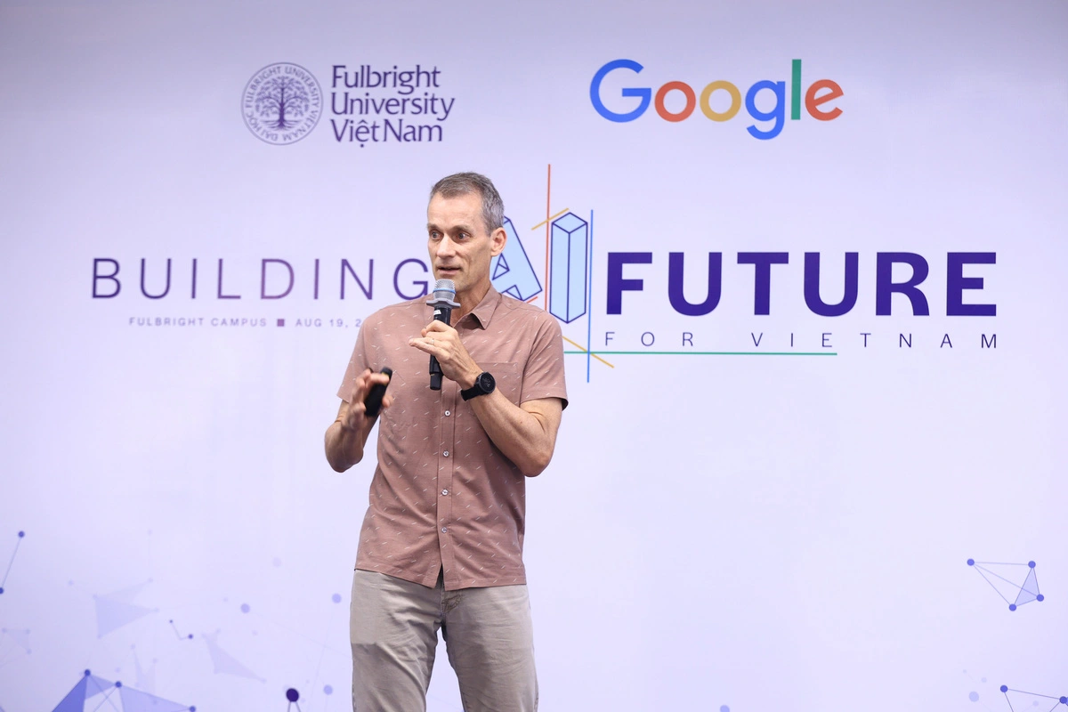 TS Jeff Dean trong buổi nói chuyện với sinh viên Trường đại học Fulbright ngày 19/8 - Ảnh: TRỌNG NHÂN