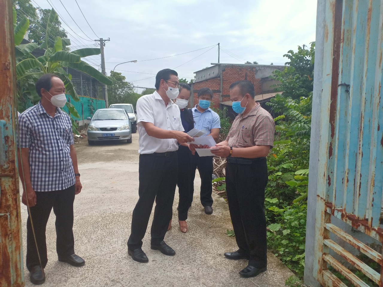 Ông Võ Minh Thành (áo trắng) tặng quà cho lực lượng phòng, chống dịch ở Đức Huệ