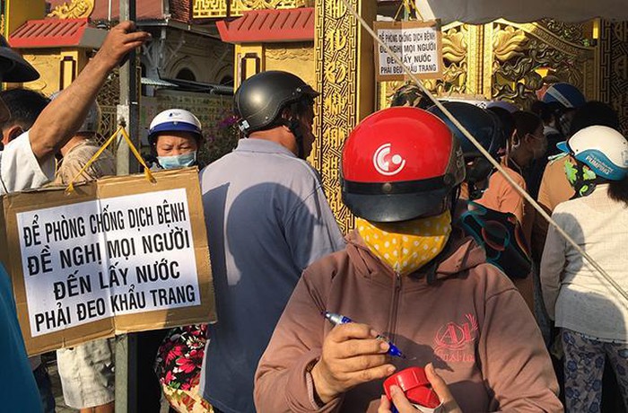 | Vẫn không quên phòng chống dịch Covid - 19 khi mọi người tập trung lấy nước sinh hoạt |