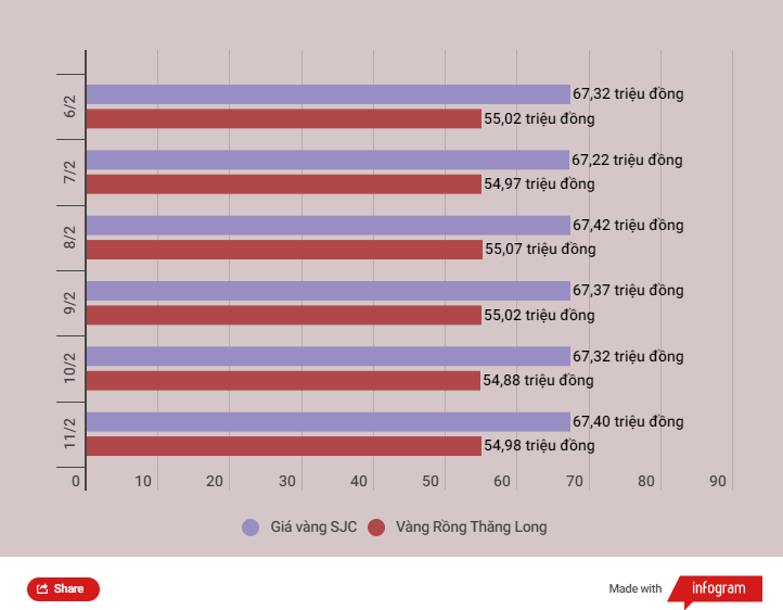 Trong khi đó, cũng vào tuần trước, giá vàng Rồng Thăng Long của Công ty Bảo Tín Minh Châu giảm 40.000 đồng/lượng. Đến sáng nay (13/2), doanh nghiệp này niêm yết chiều mua vào và bán ra từ 54,08-54,93 triệu đồng/lượng, giảm 50.000 đồng/lượng so với chốt phiên trước.