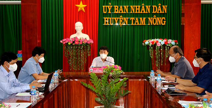 | Đồng chí Lê Quốc Phong làm việc với lãnh đạo huyện Tam Nông về công tác phòng, chống dịch COVID-19 (Ảnh: dongthap.gov) |