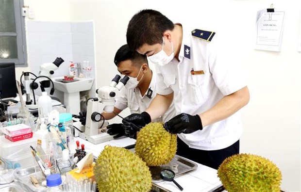 Thực hiện kiểm dịch sầu riêng quả tươi xuất khẩu qua Cửa khẩu Quốc tế Hữu Nghị. (Ảnh: Anh Tuấn/TTXVN)