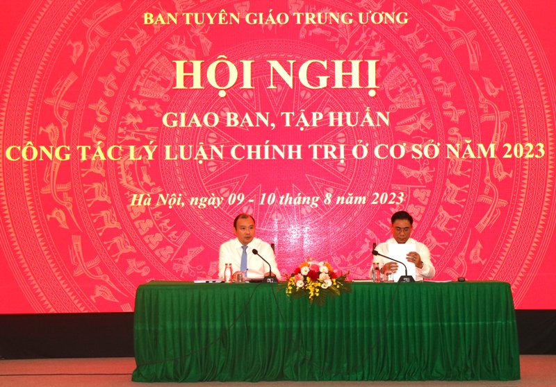 Chiều 9/8, Ban Tuyên giáo Trung ương tổ chức Hội nghị giao ban, tập huấn công tác giáo dục lý luận chính trị ở cơ sở năm 2023 bằng hình thức trực tiếp tại TP Hà Nội (điểm cầu Trung ương), kết hợp trực tuyến đến 9 điểm cầu tỉnh ủy, thành ủy (Hải Phòng, Thái Nguyên, Tuyên Quang, Sơn La, Hà Tĩnh, Đắk Lắk, Bình Định, Cần Thơ, Bình Dương).