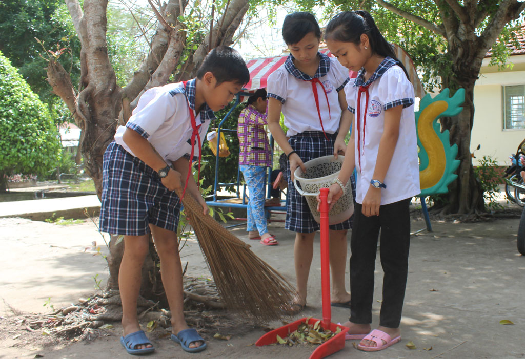 Học sinh Trường Tiểu học Nhơn Ninh A dọn dẹp vệ sinh trường lớp