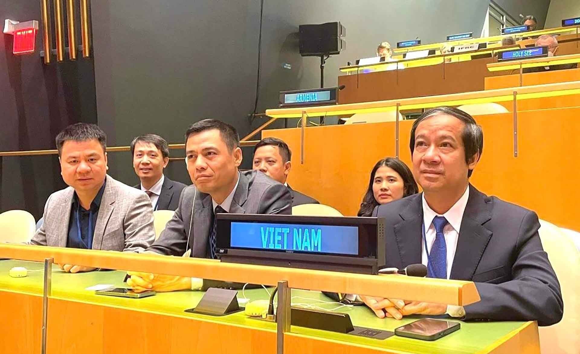 | Bộ trưởng Giáo dục và Đào tạo Nguyễn Kim Sơn (ngoài cùng bên phải) dẫn đầu đoàn Việt Nam tham dự Hội nghị (Ảnh: Phái đoàn Việt Nam tại LHQ) |