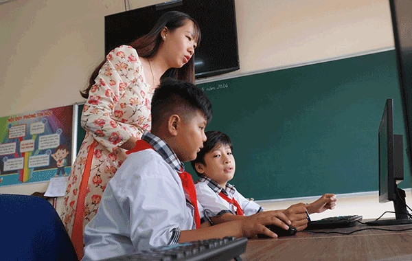 Cô trò Trường Tiểu học Phú Thứ 2 (quận Cái Răng, TP Cần Thơ) thực hành trên máy tính. Ảnh: B.NG
