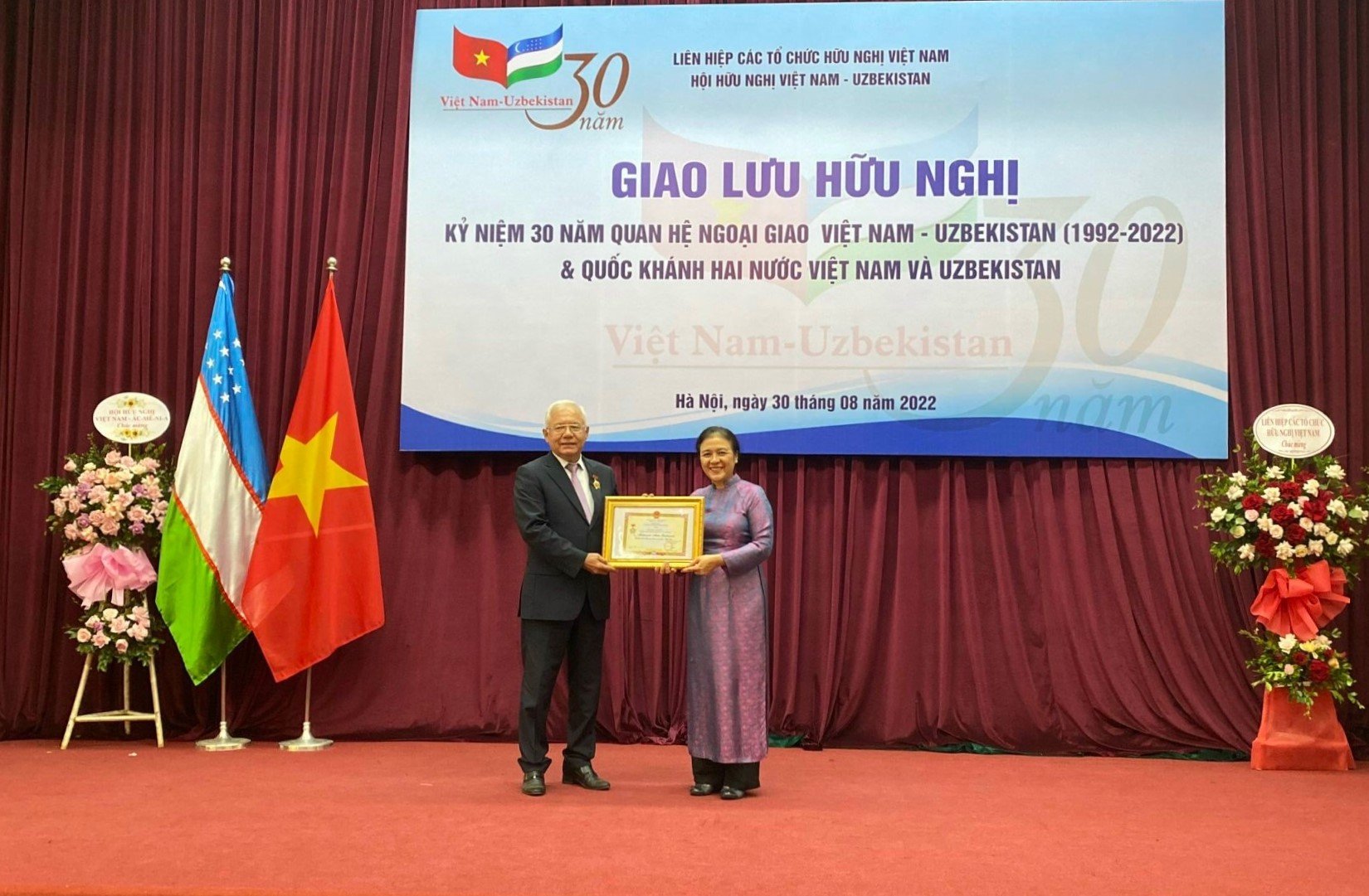 Ngày 30/8, tại Hà Nội, Hội Hữu nghị Việt Nam – Uzbekistan tổ chức buổi Giao lưu Hữu nghị kỷ niệm 30 năm Quan hệ ngoại giao Việt Nam – Uzbekistan và Quốc khánh hai nước Việt Nam và Uzbekistan.