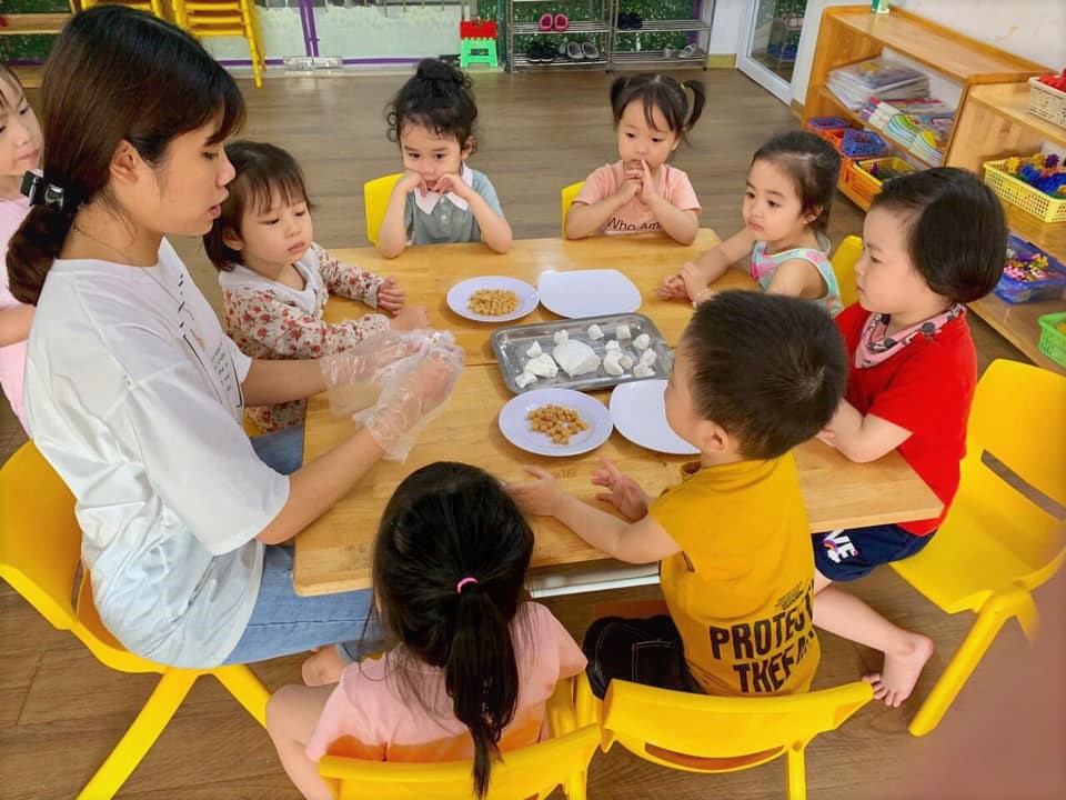 | Cô Lê Huyền Trang trong tiết học với các bé ở Trường Mầm non tư thục A New Day. (Ảnh chụp 4/2021). |