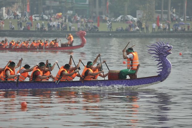 Giải Bơi chải thành phố Việt Trì mở rộng được tổ chức và đã trở thành sự kiện thể thao thường niên vào mỗi dịp Giỗ Tổ Hùng Vương. (Ảnh: TTXVN)