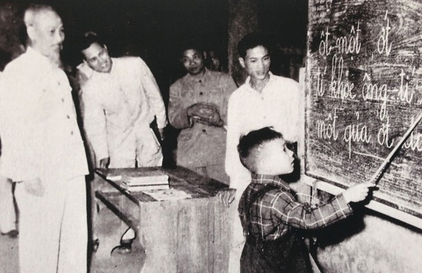 Bác Hồ đang theo dõi một cháu nhỏ đánh vần khi đến thăm lớp vỡ lòng ở phố Hàng Than, Hà Nội, năm 1958 (Ảnh internet)