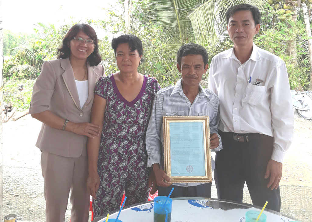Phó Chủ tịch Liên đoàn Lao động tỉnh - Lê Thị Thu Cúc trao “Mái ấm Công đoàn” cho anh Lê Quang Trưởng, xã Bình Hòa Bắc, huyện Đức Huệ