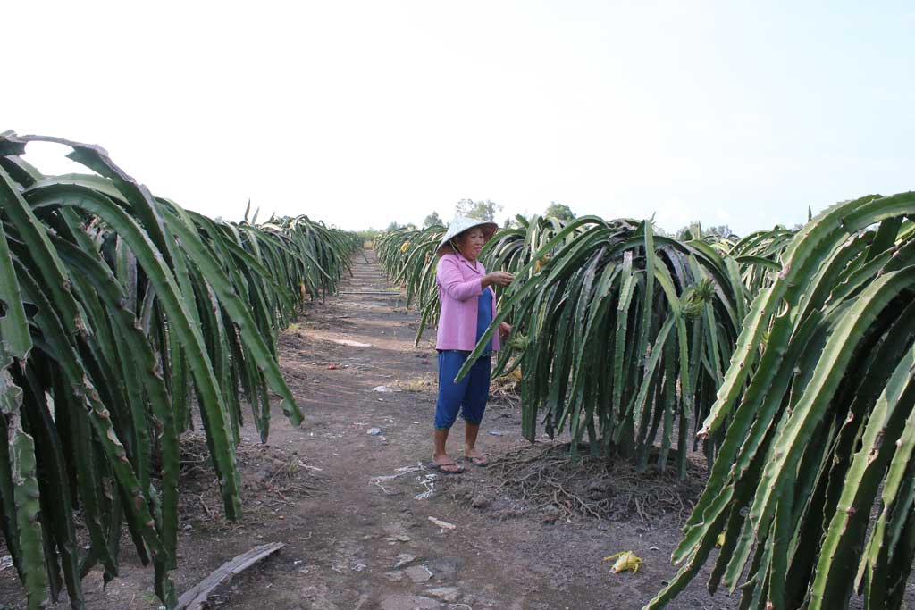 Tổ trưởng Tổ Liên kết trồng thanh long ruột đỏ ấp 3B - Lê Thị Cả chia sẻ, trước đây, cuộc sống gia đình bà rất khó khăn. Với 0,4 ha đất, vợ chồng bà cứ loay hoay trồng mía, trồng chanh,... nhưng đất ở đây bị nhiễm mặn nên năng suất cây trồng không cao, do đó thường xuyên thua lỗ, cái nghèo luôn đeo đẳng. Cách đây khoảng 5 năm, trong một lần tình cờ, vợ chồng bà biết đến cây thanh long ruột đỏ và hiệu quả mang lại từ giống cây trồng này. Hai người cùng nhau bàn bạc, gom góp tiền tiết kiệm và vay mượn những người thân quen, trồng thử nghiệm 0,4ha. Trong lúc gia đình chuẩn bị trồng thanh long, chồng bà không may qua đời. Trách nhiệm gia đình lại “đè nặng” lên đôi vai của bà. Bà dặn lòng không được ngã quỵ, hàng ngày siêng năng tìm tòi, học hỏi kỹ thuật từ những người quen biết, tích cực cải tạo đất để trồng thanh long ruột đỏ. Thanh long cho trái, vụ đầu tiên bà mừng khôn xiết. Những vụ sau đó, năng suất tăng lên gấp nhiều lần. Sản xuất có lãi, số tiền tích lũy, bà mua và mướn thêm đất để trồng thanh long. Sau 5 năm dành dụm, hiện bà có gần 3ha đất. Nhờ trồng thanh long, cuộc sống gia đình bà khấm khá hẳn lên. Căn nhà tạm trước đây được xây mới bằng ngôi nhà tường khang trang, thoáng mát.