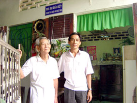 | Ông Nguyễn Thành Nam, Chủ tịch UBMTTQ phường An Lạc (bìa phải) và ông Dương Văn Bộ trước căn nhà đại đoàn kết vừa nâng cấp của ông Bộ. Ảnh: KIỀU CHINH |