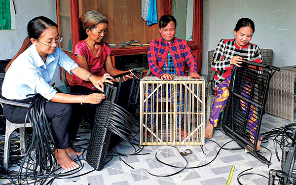 Chị em tham gia mô hình đan dây nhựa để tăng thu nhập, trang trải kinh tế gia đình.
