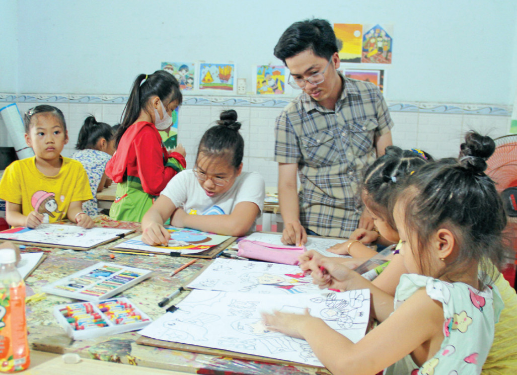 Anh Lê Duy Cường (xã Mỹ Hạnh Nam, huyện Đức Hòa) hướng dẫn các bé vẽ