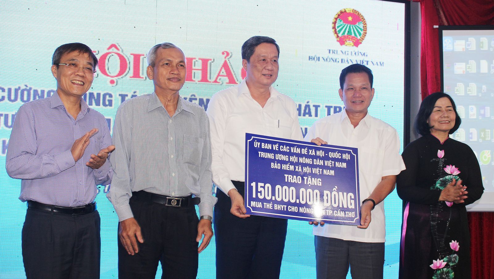 Phó Bí thư Thường trực Thành ủy Cần Thơ Phạm Văn Hiểu (đứng giữa) nhận 150 triệu đồng mua BHYT cho nông dân thành phố, do các đơn vị trao tặng.