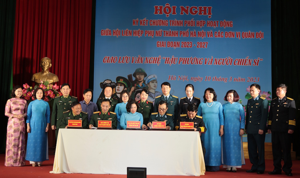 Ngày 10/3, Hội Liên hiệp phụ nữ TP Hà Nội tổ chức Hội nghị ký kết chương trình phối hợp hoạt động với các đơn vị quân đội giai đoạn 2023 - 2027 gồm Cục Chính trị Bộ Tư lệnh Thủ đô, Bộ Chỉ huy Bộ đội Biên phòng tỉnh Kon Tum, Sư đoàn Phòng không 361, Lữ đoàn đặc công Hải quân 126.