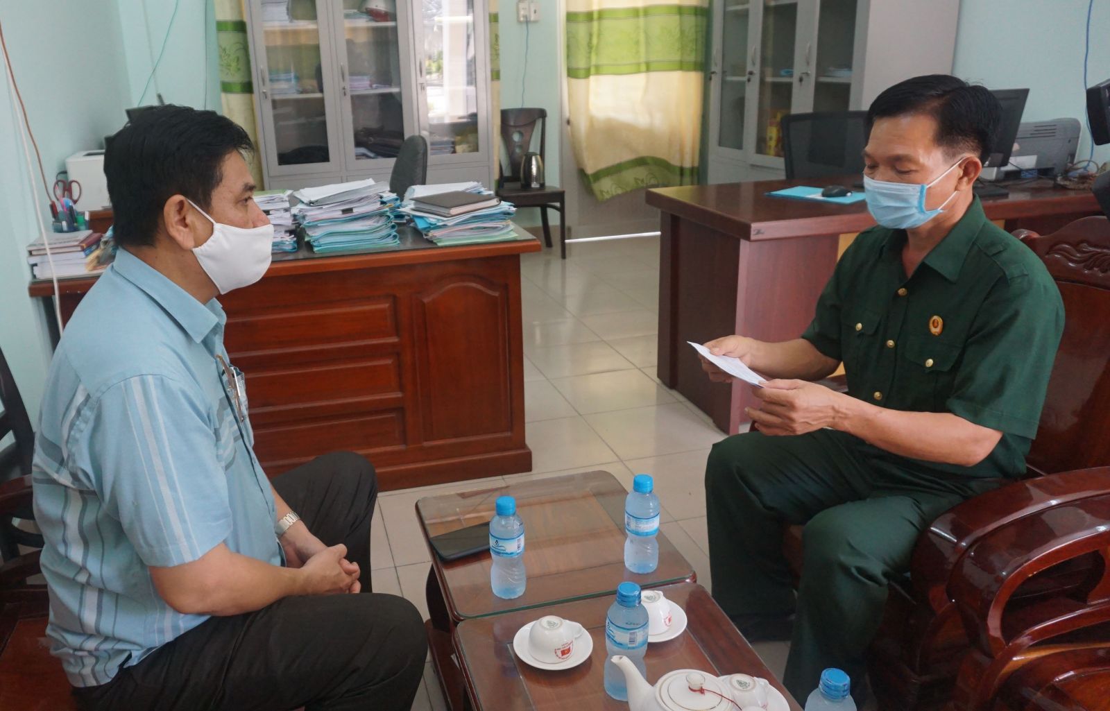 Cựu chiến binh (CCB) Nguyễn Ngọc Đời - chủ cửa hàng điện, điện tử Út Đời, khu phố 7, thị trấn Bến Lức, chủ động đến UBMTTQ Việt Nam huyện Bến Lức ủng hộ 3 triệu đồng vào Quỹ Vắc-xin phòng Covid-19 và gửi tặng 2 triệu đồng cùng 80 kính chắn giọt bắn cho lực lượng tuyến đầu chống dịch.