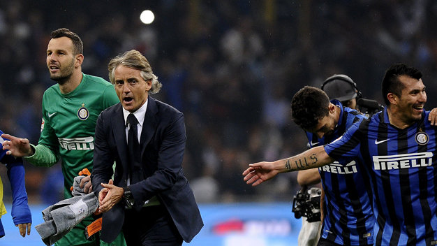 HLV Roberto Mancini (thứ hai từ trái) ăn mừng chiến thắng cùng các cầu thủ Inter Milan - Ảnh: Reuters