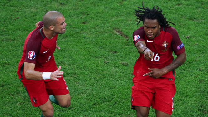 Niềm vui của Renato Sanches (phải) sau khi gỡ hòa cho Bồ Đào Nha. Ảnh: AFP