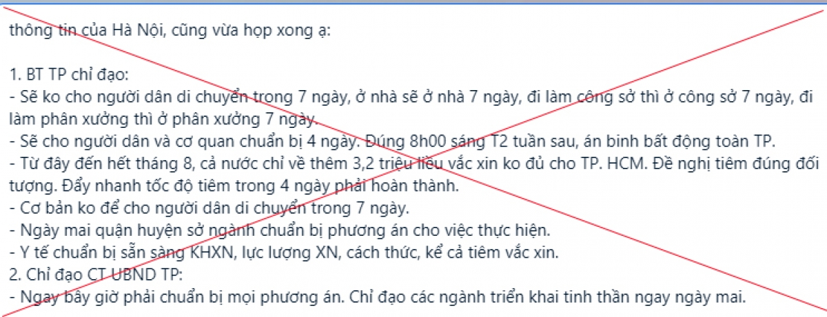 Trước đó, trên mạng xã hội lan truyền nội dung thông tin giả mạo như sau: "1. BT TP chỉ đạo: