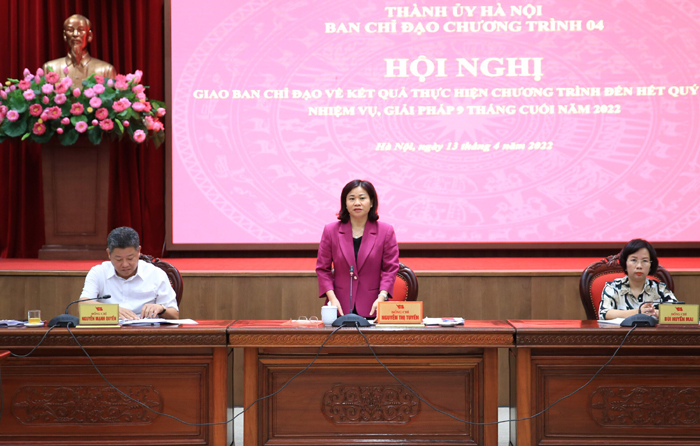Ngày 13/4, Ủy viên Trung ương Đảng, Phó Bí thư Thường trực Thành ủy, Trưởng Ban Chỉ đạo Chương trình 04-CTr/TU Thành ủy Hà Nội Nguyễn Thị Tuyến chủ trì hội nghị giao ban Ban Chỉ đạo, đánh giá kết quả thực hiện Chương trình 04-CTr/TU đến hết quý I/2022, triển khai nhiệm vụ, giải pháp 9 tháng cuối năm.