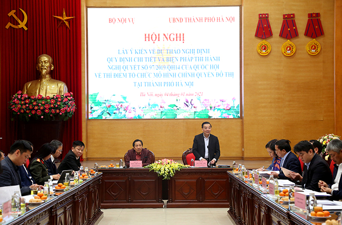 Chiều 4/1, Bộ Nội vụ phối hợp với UBND TP Hà Nội tổ chức Hội nghị “Lấy ý kiến về dự thảo Nghị định quy định chi tiết và biện pháp thi hành Nghị quyết số 97/2019/QH14 ngày 27-11-2019 của Quốc hội về thí điểm tổ chức mô hình chính quyền đô thị tại thành phố Hà Nội”.