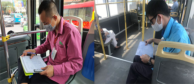 | Ngoài việc ghi chép thông tin y tế, nhân viên phục vụ tại các tuyến xe buýt |