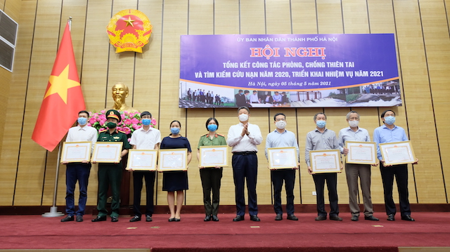 | Phó Chủ tịch UBND TP Hà Nội Nguyễn Mạnh Quyền trao tặng Bằng khen cho các tập thể, cá nhân có thành tích trong công tác phòng, chống thiên tai và tìm kiếm cứu nạn năm 2020 |