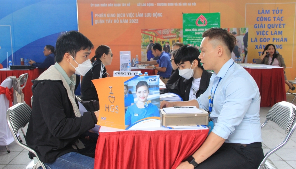 | Người lao động tham gia ứng tuyển, tìm kiếm việc làm tại phiên giao dịch việc làm quận Tây Hồ (Hà Nội) năm 2022. (Ảnh: Lương Hằng) |