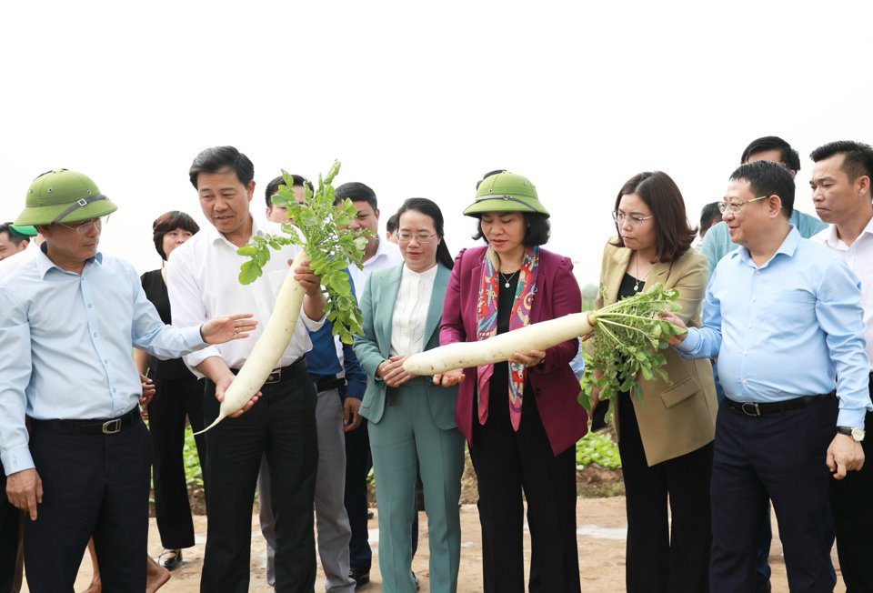 | Phó Bí thư Thường trực Thành ủy Hà Nội Nguyễn Thị Tuyến thăm, động viên sản xuất tại vùng trồng rau ở xã Tráng Việt. |