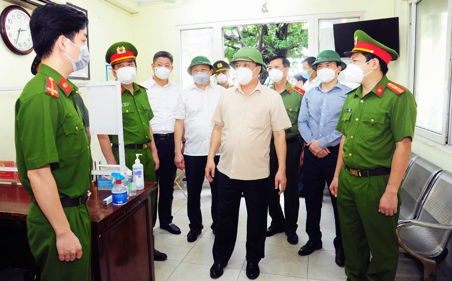 | Bí thư Thành ủy Hà Nội Đinh Tiến Dũng kiểm tra công tác trực ban phòng, chống dịch COVID-19 của Công an phường Văn Miếu (quận Đống Đa). |