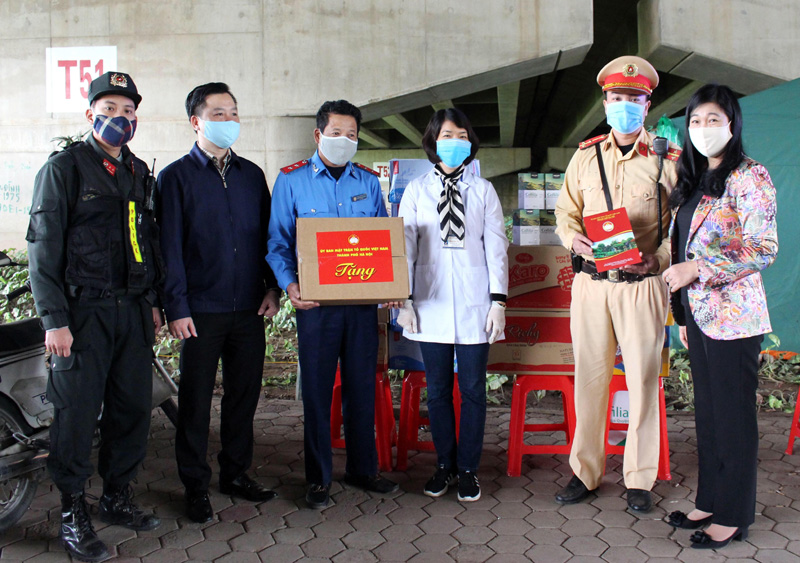 Dịp này, Ủy ban MTTQ Việt Nam TP Hà Nội đã tặng khẩu trang và các nhu yếu phẩm thiết yếu, phục vụ các lực lượng làm nhiệm vụ.