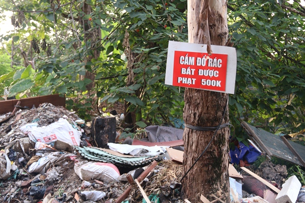 | Một bãi rác tự phát ngang nhiễn tồn tại dù đã có biển cấm. (Ảnh: Thúy Hằng) |