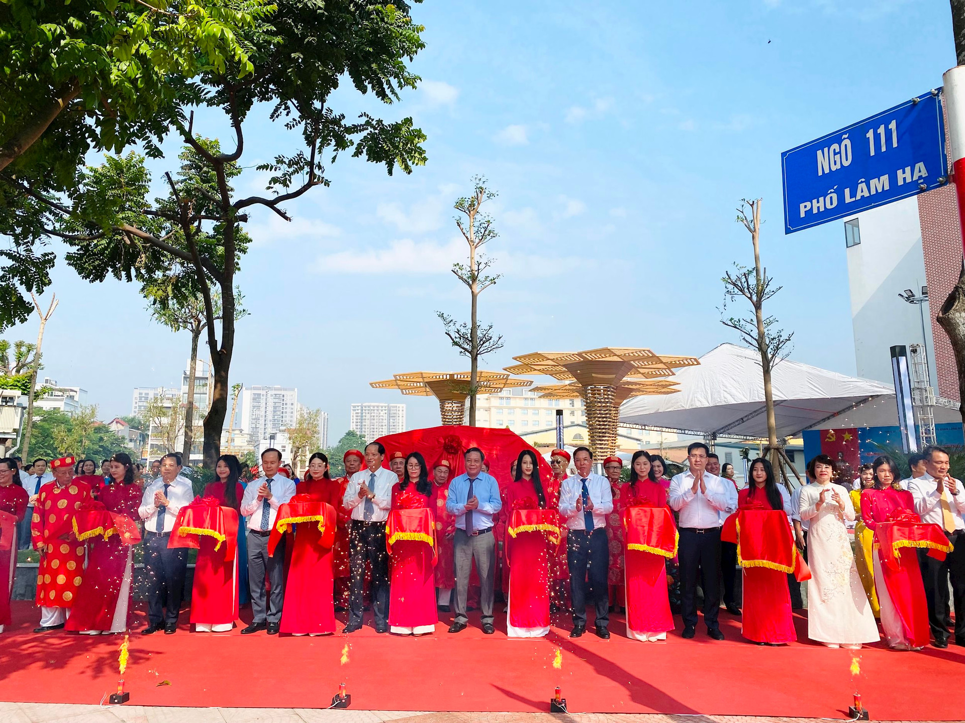 | Phó Bí thư Thành ủy Hà Nội Nguyễn Văn Phong cùng các đồng chí lãnh đạo thành phố và đại biểu cắt băng khánh thành dự án công viên Lâm Hạ. |