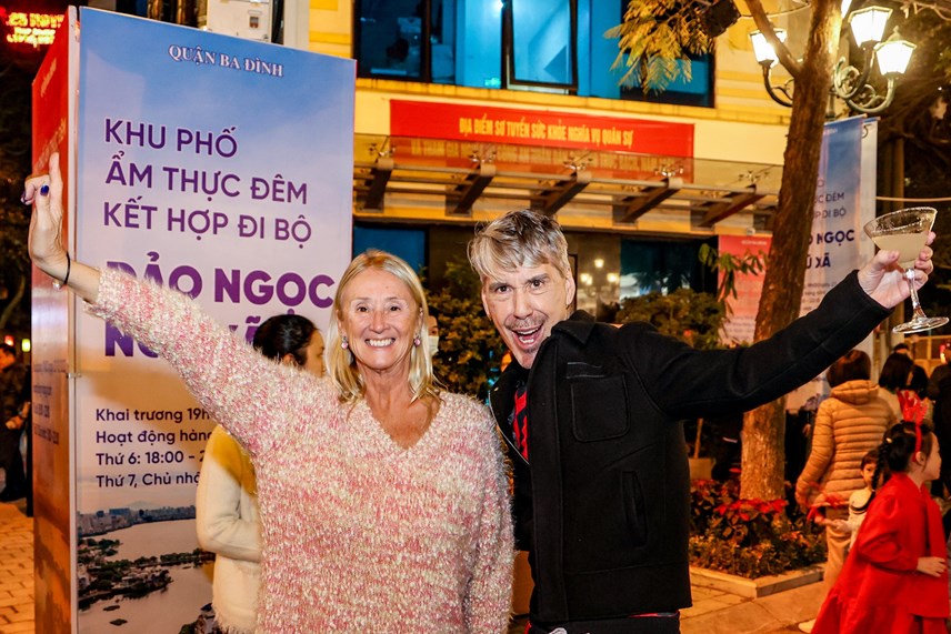 | Du khách nước ngoài hân hoan trong ngày khai trương Khu phố ẩm thực đêm kết hợp đi bộ Đảo Ngọc - Ngũ Xã. (Ảnh: Lê Khánh) |