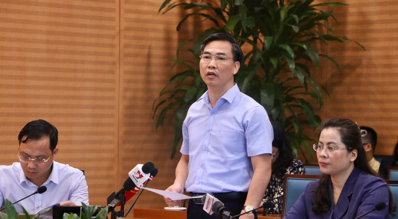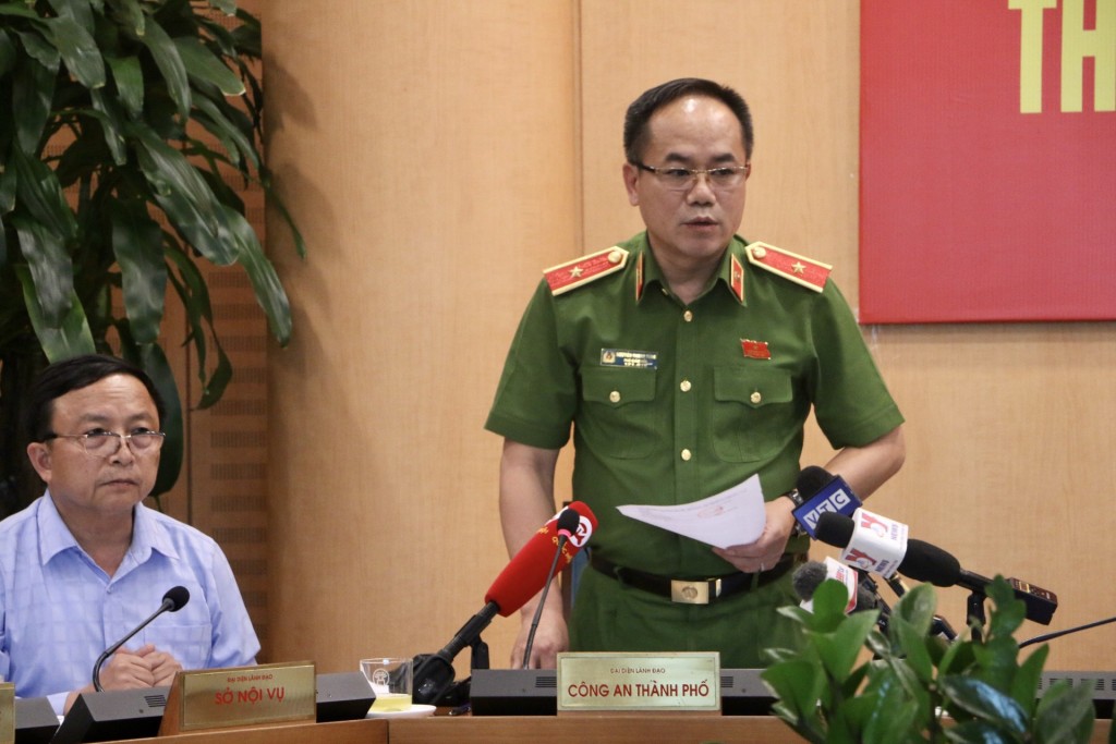 | Phó Giám đốc CATP Hà Nội Nguyễn Thanh Tùng thông tin tại buổi họp báo. |