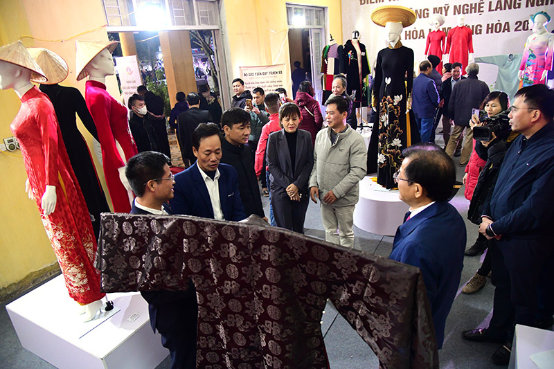 | Các đại biểu tham quan khu trưng bày sản phẩm áo dài làng Trạch Xá, xã Hòa Lâm. |
