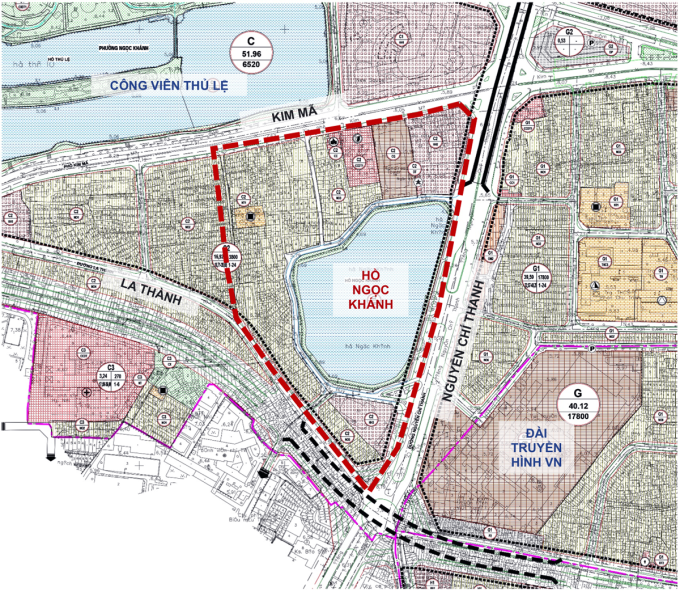 | Khu vực nghiên cứu tổ chức phố đi bộ quanh hồ Ngọc Khánh (viền đỏ). Đồ họa: Quận Ba Đình cung cấp |