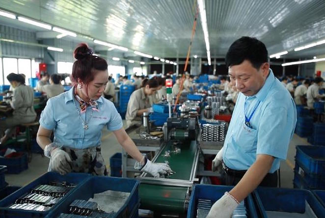| Công nhân làm việc trong dây chuyền sản xuất của Công ty cổ phần Khóa Việt - Tiệp |