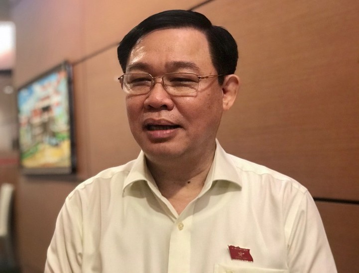 | Bí thư Thành ủy Hà Nội Vương Đình Huệ trao đổi với báo chí bên lề hành lang Quốc hội chiều 8/6. (Ảnh: Vân Anh) |