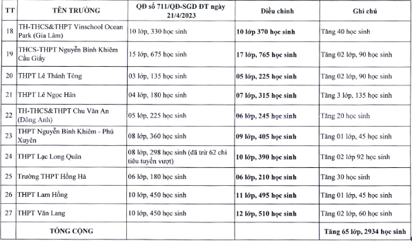 Đáng chú ý, Trường THCS-THPT Tạ Quang Bửu được tuyển thêm 3 lớp với 135 học sinh; Trường THPT Phan Huy Chú, Đống Đa được tuyển thêm 50 học sinh. Đây là các trường đã xảy ra hiện tượng phụ huynh xếp hàng xuyên đêm để nộp hồ sơ xin học.