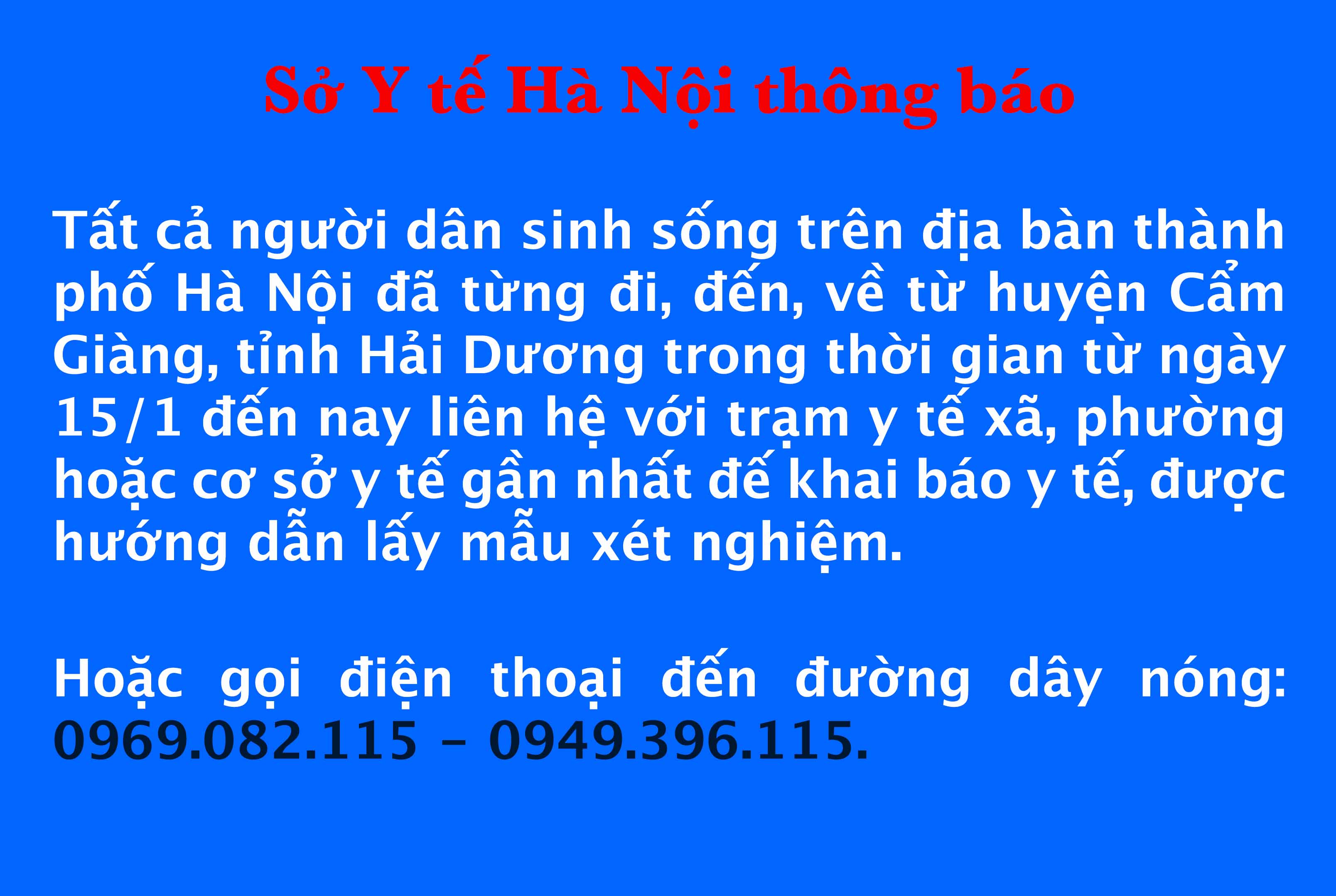 Theo đó, tất cả người dân sinh sống trên địa bàn thành phố Hà Nội đã từng đi, đến, về từ huyện Cẩm Giàng, tỉnh Hải Dương trong thời gian từ ngày 15/1 đến nay chủ động liên hệ với trạm y tế xã, phường hoặc cơ sở y tế gần nhất để khai báo y tế, được hướng dẫn lấy mẫu xét nghiệm SARS-CoV-2 và giám sát sức khỏe; hoặc gọi điện thoại đến đường dây nóng phòng chống dịch: 0969.082.115 - 0949.396.115.